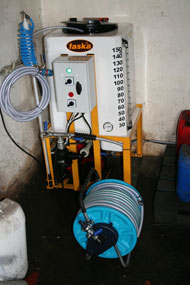 Najpopularniejszym rozwiązaniem jest półautomatyczna kurtyna wolnostojąca na bramie wjazdowej na teren fermy / gospodarstwa / zakładu. Roztwór środka dezynfekcyjnego przygotowany jest w niej mechanicznie w zbiorniku wykonanym z laminatu, który umieszczony został na ramie stalowej malowanej proszkowo. Układ wyposażony w wydajną pompę z silnikiem 230V. Z budynku, w którym umieszczany jest zbiornik (portiernia, stróżówka, waga itp.) wyprowadzony jest przewód tłoczny do dysz rozpyłowych kurtyny. Uruchomienie oprysku odbywa się przy pomocy przełącznika elektrycznego. Tego typu kurtyna wolnostojąca pracuje tylko w dodatniej temperaturze otoczenia, w przypadku temperatur ujemnych istnieje możliwość oprysku ręcznego za pomocą trzymetrowej lancy teleskopowej z odpowiednimi rozpylaczami.